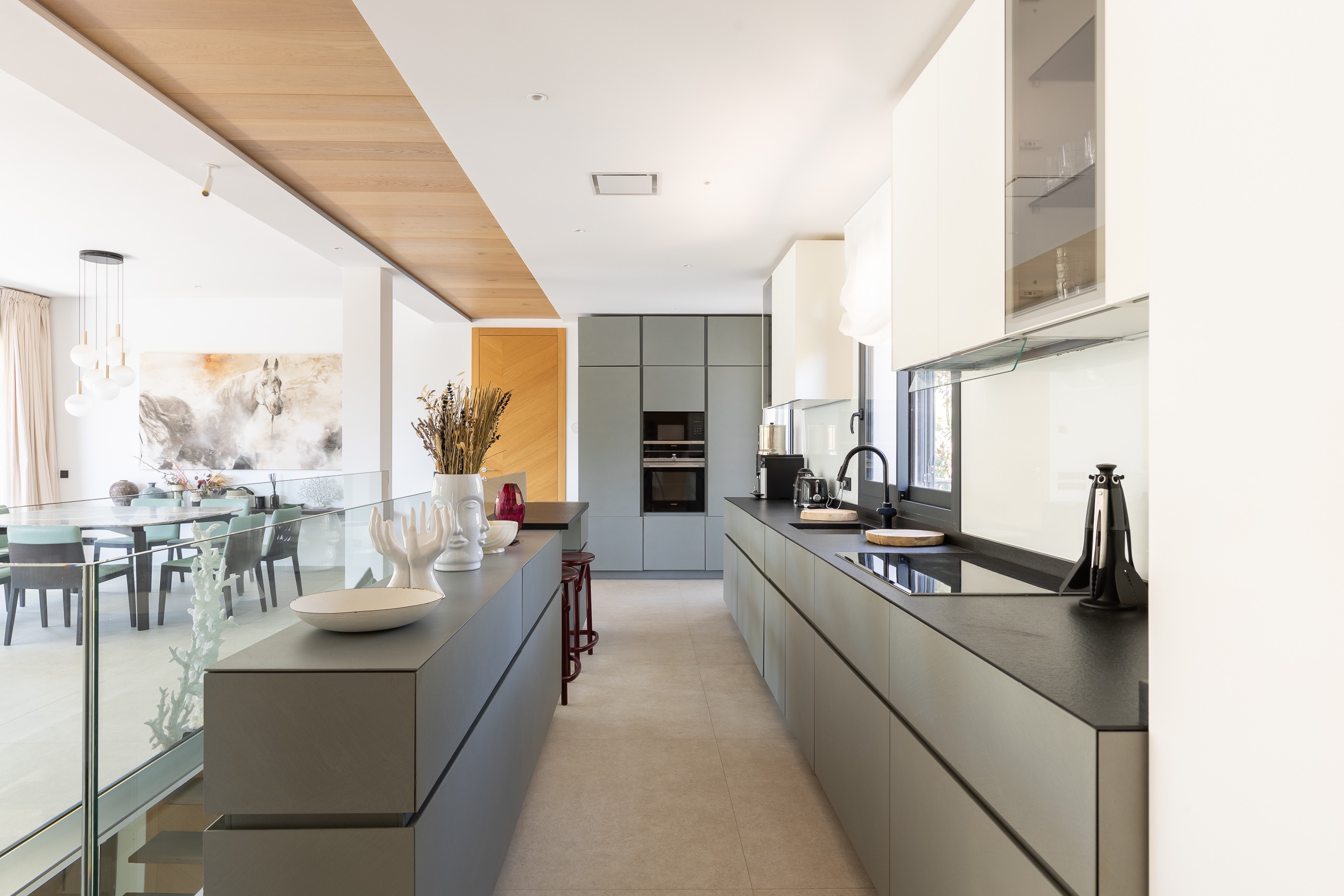 Die Hauptvilla verfügt über fünf elegante Schlafzimmer und vier luxuriöse Badezimmer. Großzügige, lichtdurchflutete Wohnbereiche öffnen sich harmonisch zum gepflegten Garten und zum privaten Pool und schaffen ein perfektes Ambiente für Entspannung und stilvolle Unterhaltung. Hochwertige italienische Einbauschränke, eine exklusive Designküche, Fußbodenheizung, zentrale Klimaanlage sowie fein ausgewählte Materialien unterstreichen den modernen, zeitlosen Charakter der Immobilie.